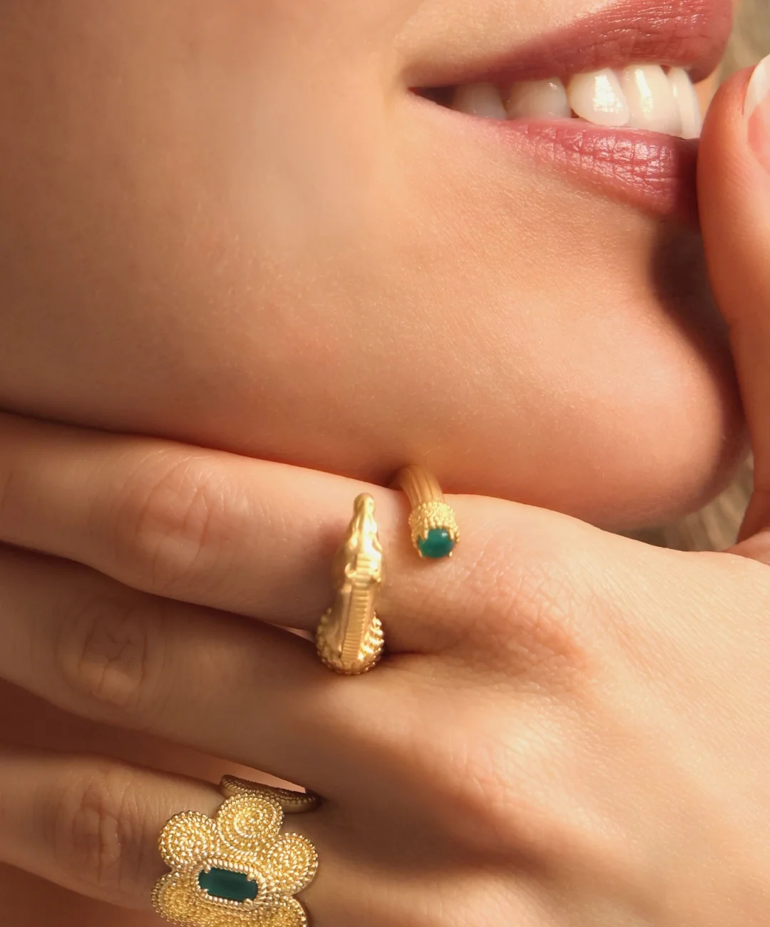 La bague Pégase est ornée de sa pierre fine en Agate Verte naturelle, symbole de protection et de bien-être.