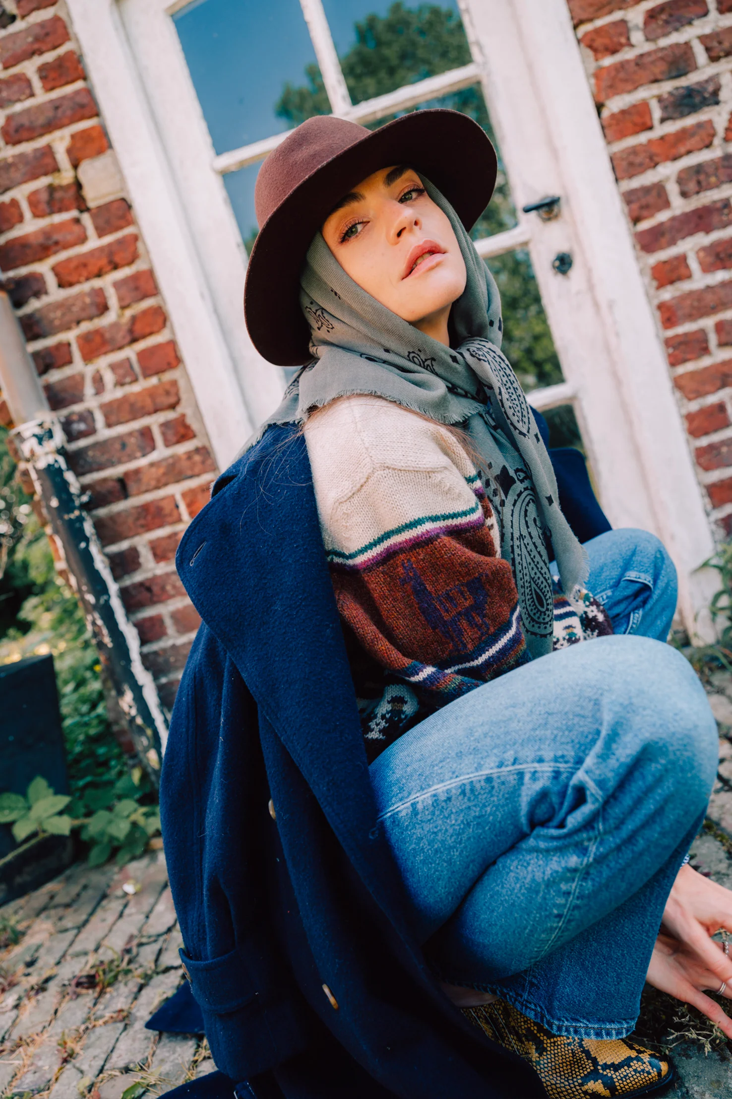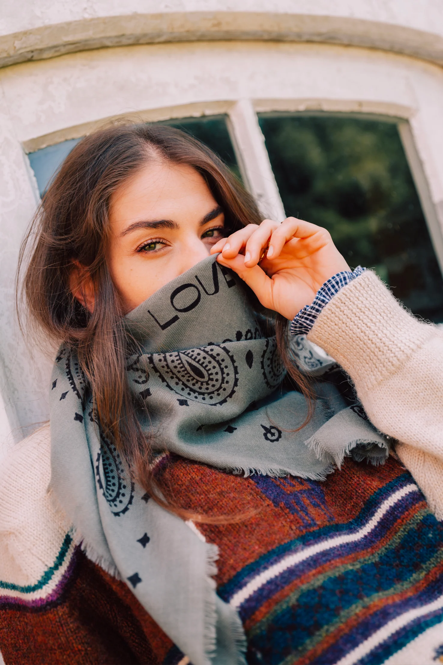 Découvrez les bandanas en laine Antan alliant l’élégance des motifs cachemire et l’esprit bohème. Fabriqués à la main en Inde, ces bandanas 100% laine d’un mètre carré, avec leurs franges délicates, arborent des motifs « Peace & Love » pour une allure hippie chic et élégante. Pour être au chaud tout l’hiver et tout en douceur.