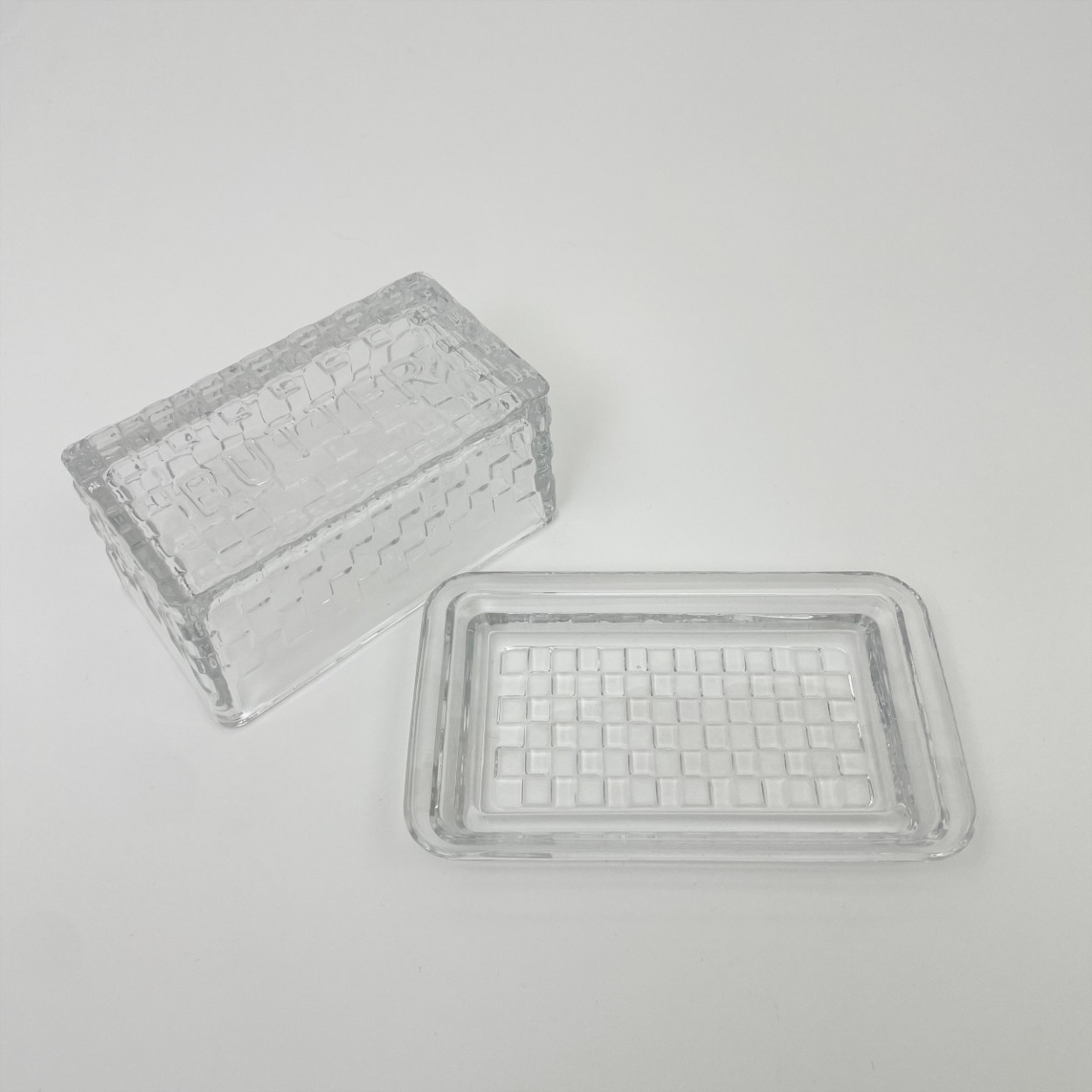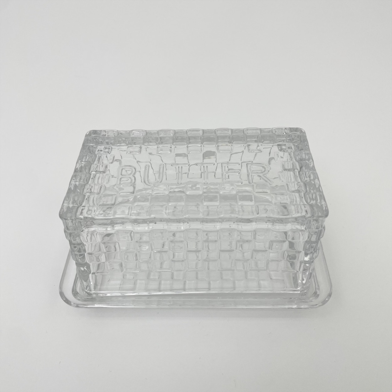 Joli beurrier en verre effet damier, inscription Butter. Design vintage.