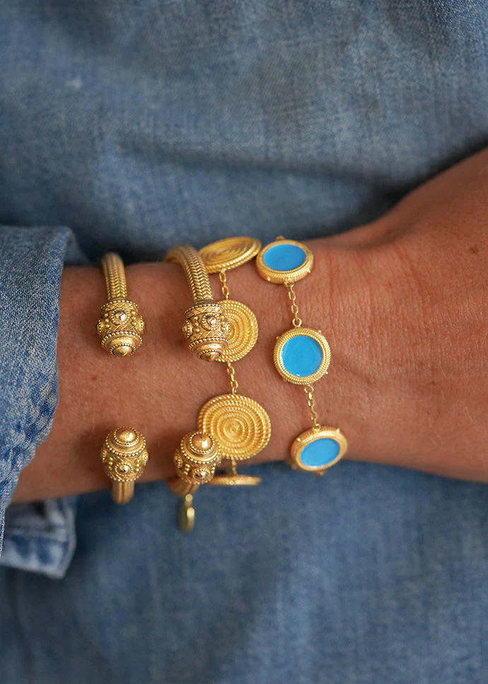 Son motif délicat, ainsi que sa présence généreuse en font une pièce iconique incontournable, qui combinent l’essence du bijou grec ancien et l’élégance.