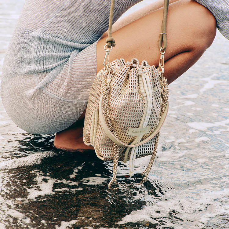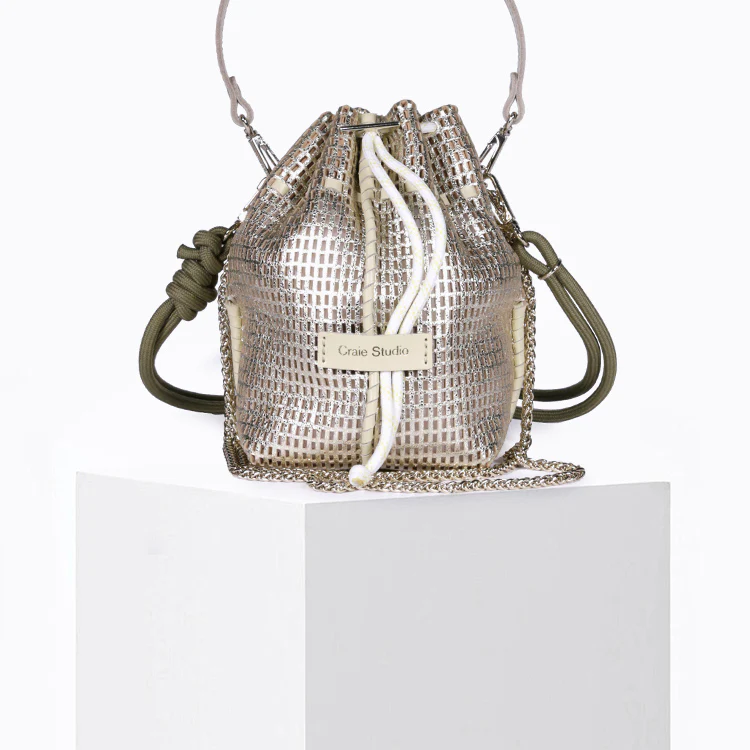 Le sac Bibi Or est un mini sac seau au design audacieux, fabriqué à la main.